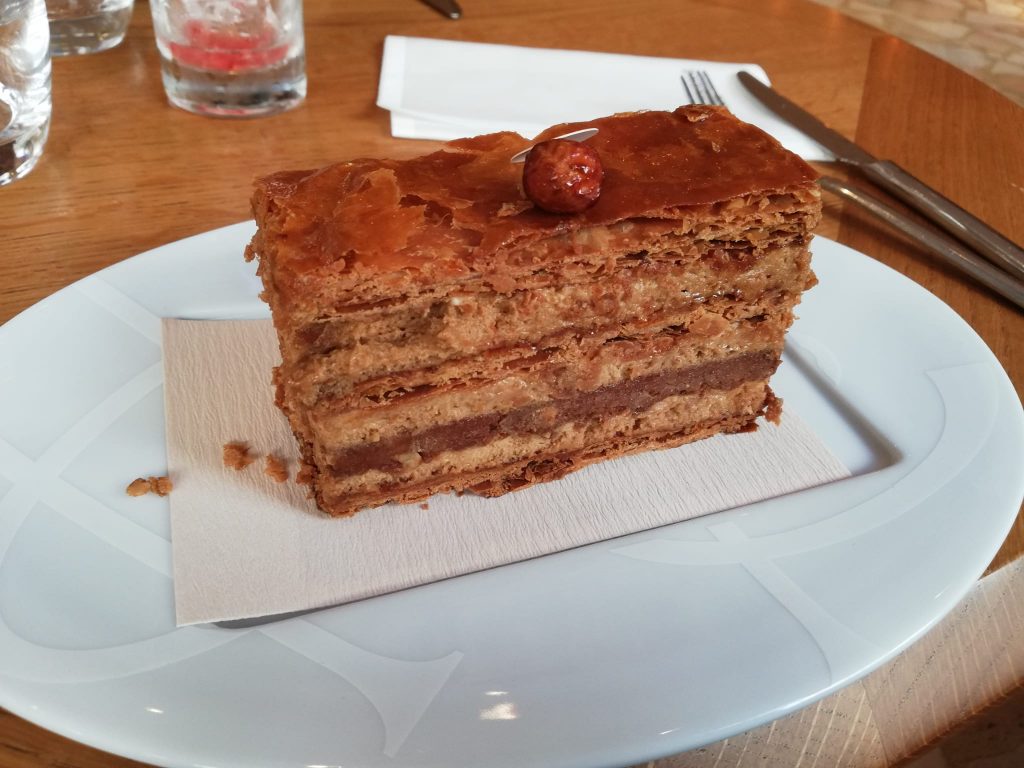Café Pierre Hermé, rue de Grenelle. Pour un mille-feuilles, c’était relativement pratique à manger ! On apprécie le multi noisette,