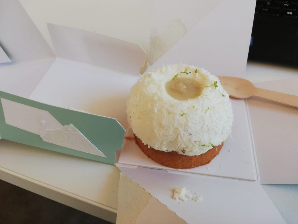Maison du Gourmet, à emporter. Biscuit trop dur à mon goût, je deviens exigeant sur l’ergonomie. Le mélange coco citron